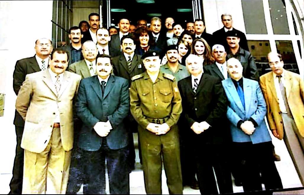 وزير الصحة د. أوميد مدحت مبارك مع نخبة من المسؤولين عند افتتاح بناية جديدة للشركة العامة لاستيراد وتوزيع الادوية والمستلزمات الطبية (كيماديا) عام 2002
